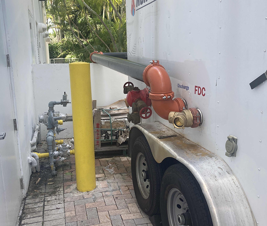 Solution: A permit was pulled and mobile temporary fire pump was mobilized and installed within 24 hours of permit approval A full capacity flow test was performed with the fire inspector to confirm that the mobile unit was capable of meeting the fire sprinkler system(s) demand.